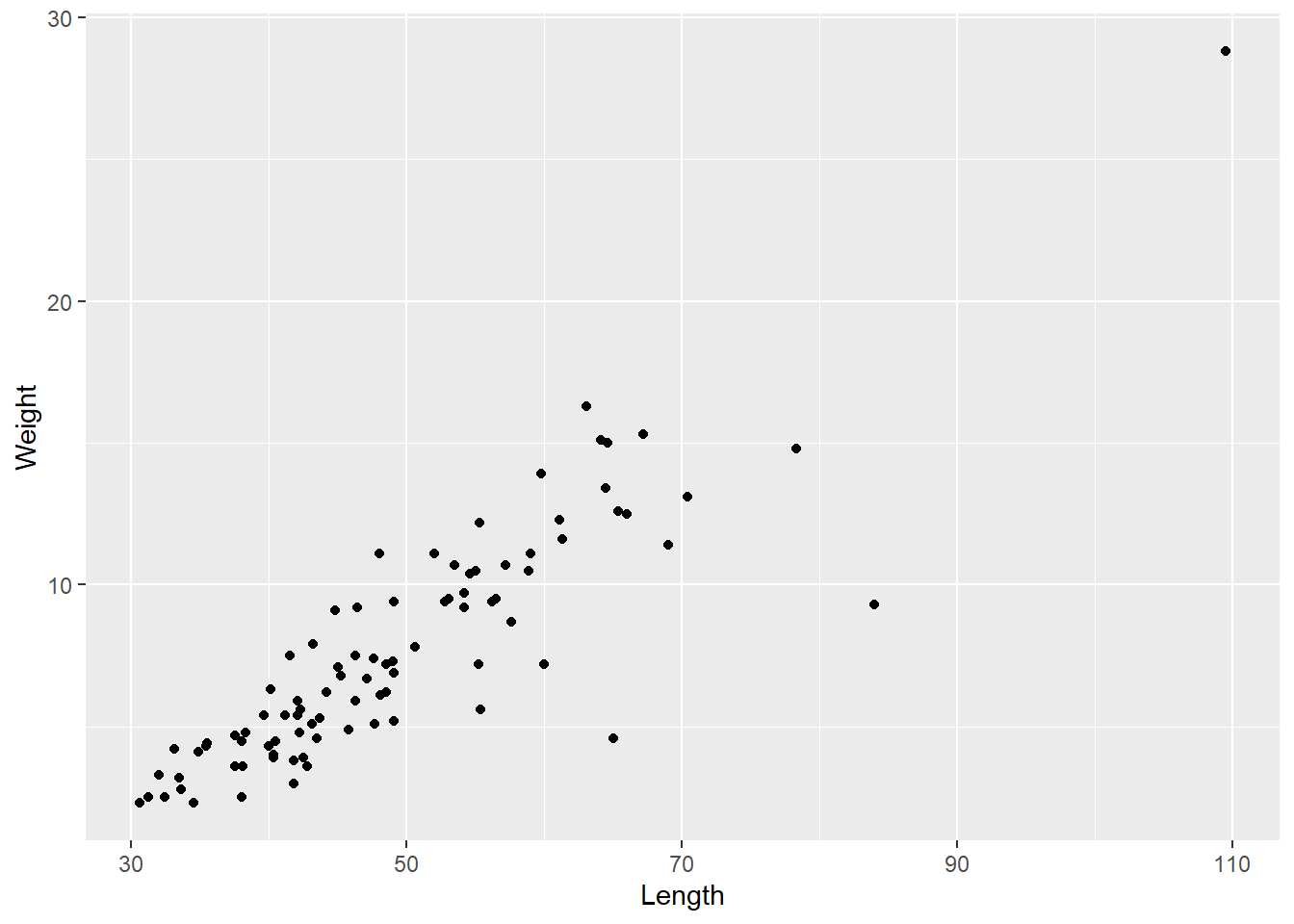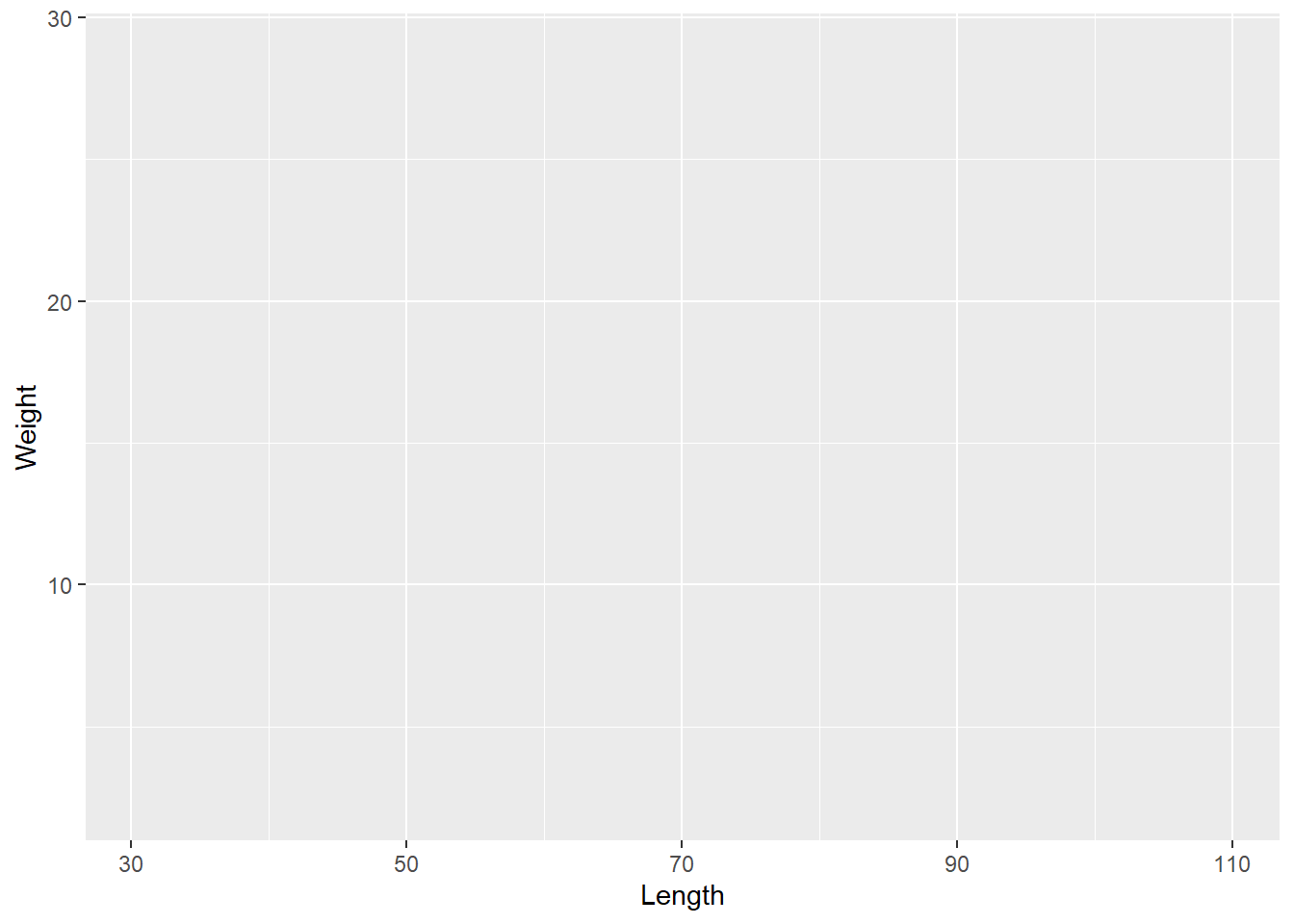 ggplot2 - you need to install and load it first!ggplot() we will need three layers - data, aesthetics / mapping and geometryggplot(data = df_dartpoints, mapping = aes(x = Length, y = Weight))+