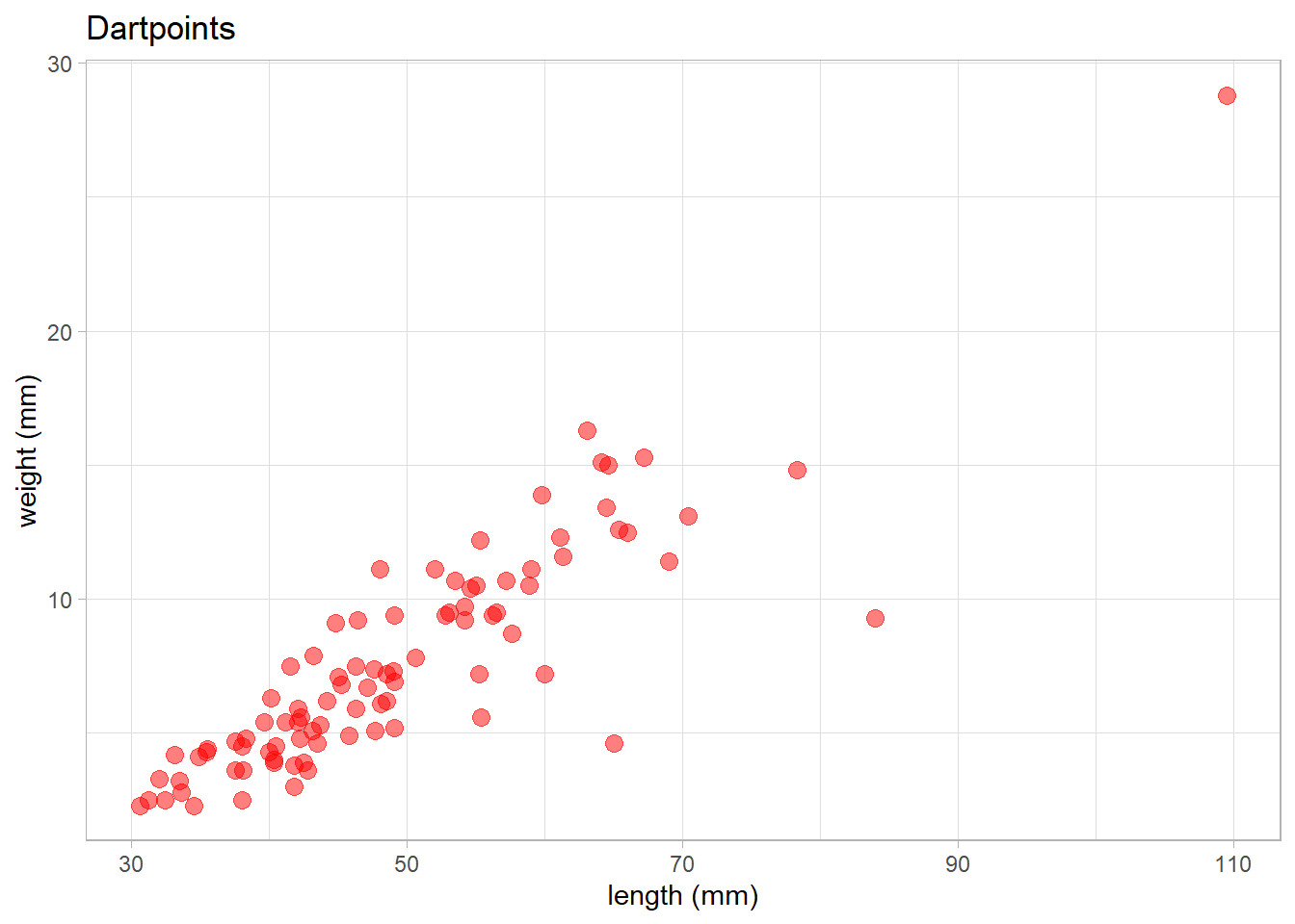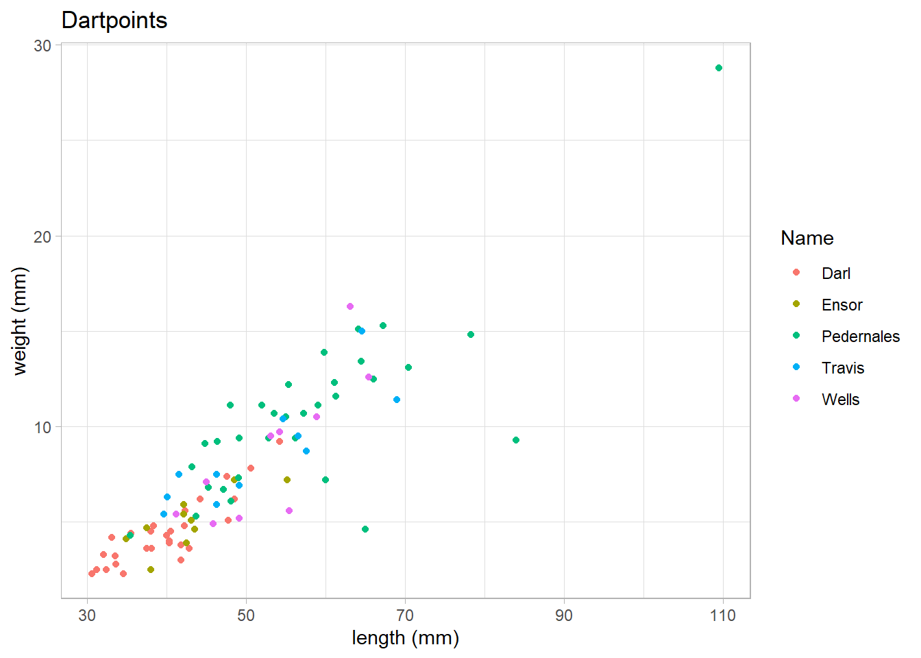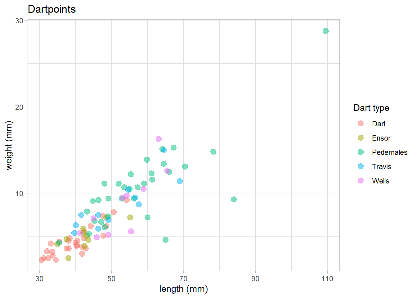 labs(title = "Dartpoints", x = "length (mm)", y = "weight (mm)") +