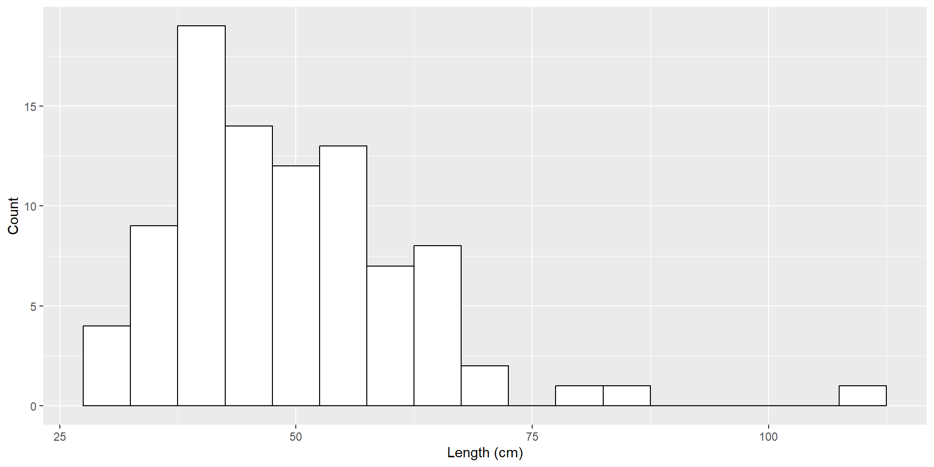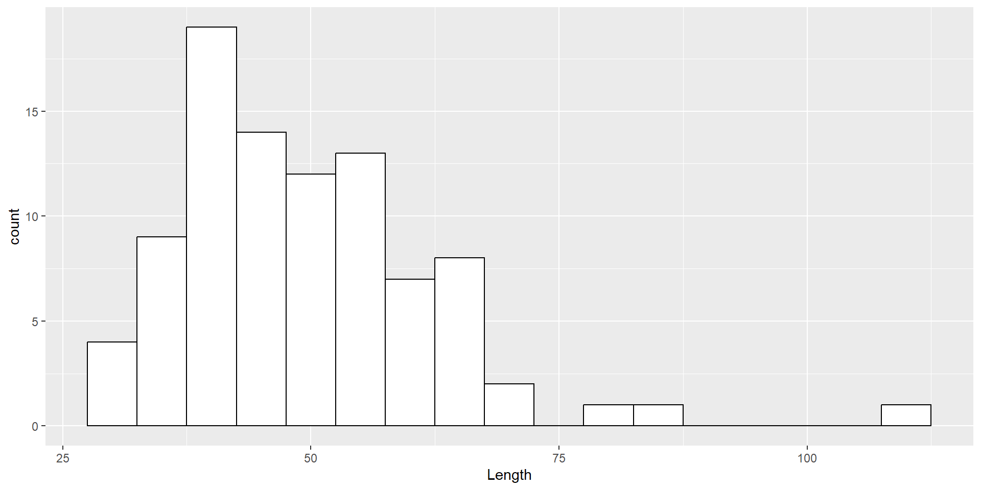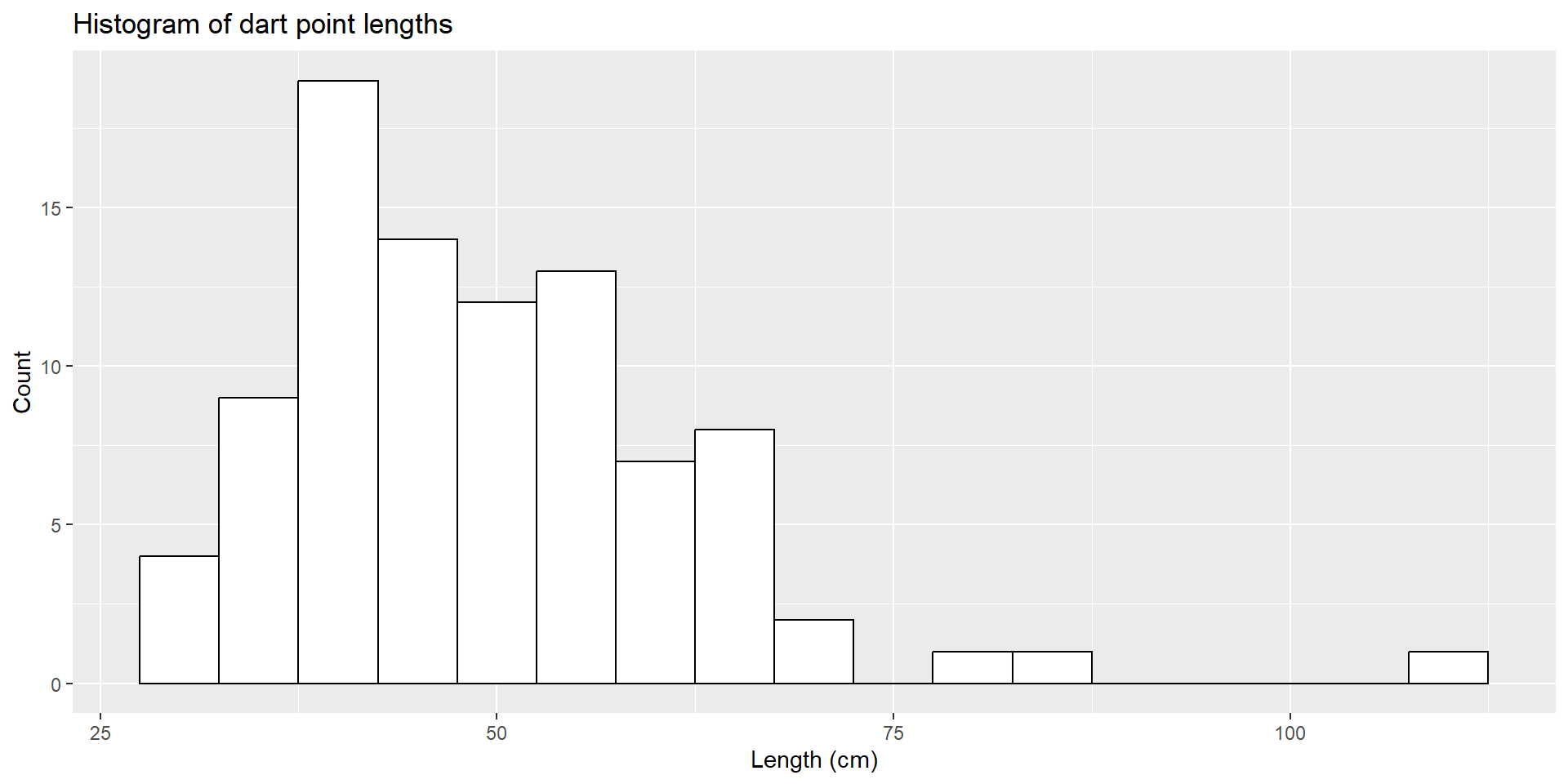 ggplot(dartpoints) +aes(x = Length) +geom_histogram(binwidth =5, color ="black", fill ="white") +labs(x ="Length (cm)", y ="Count")