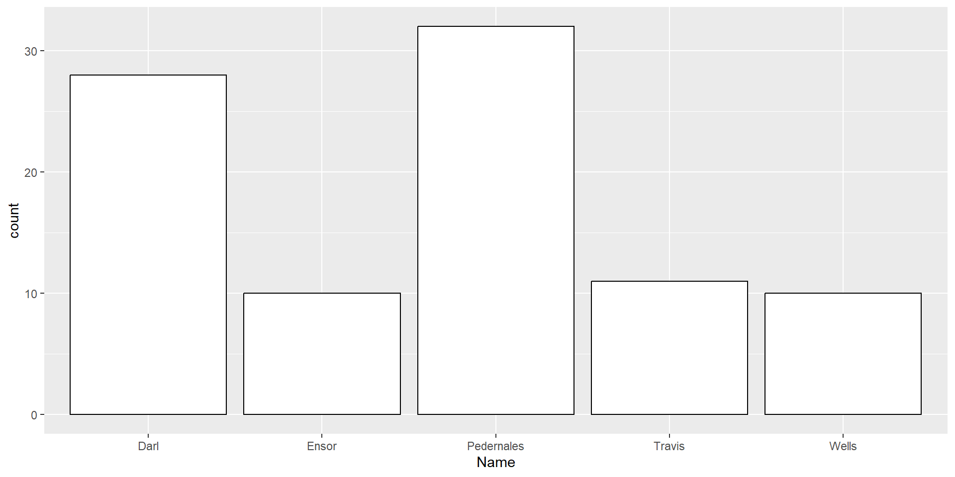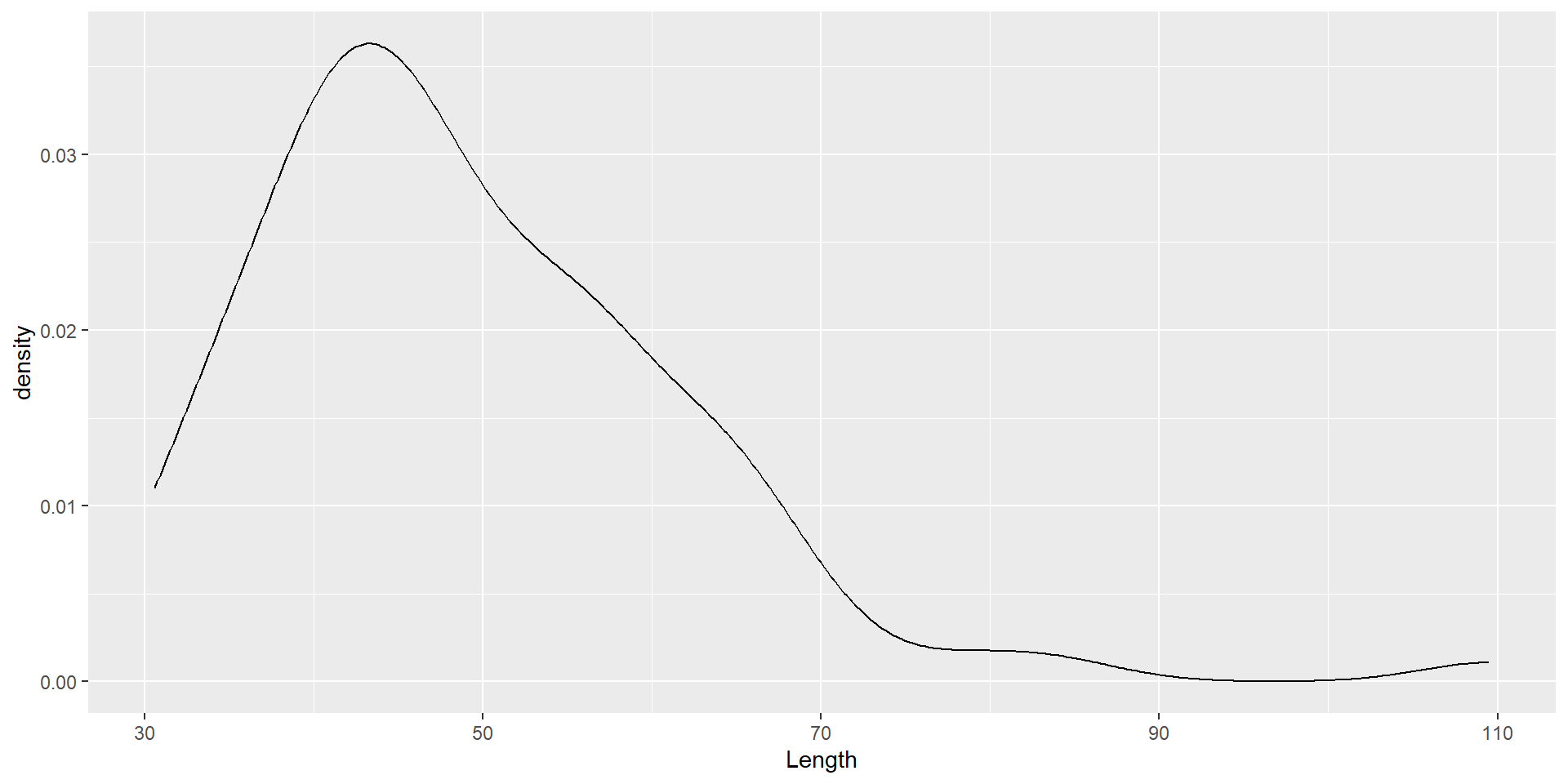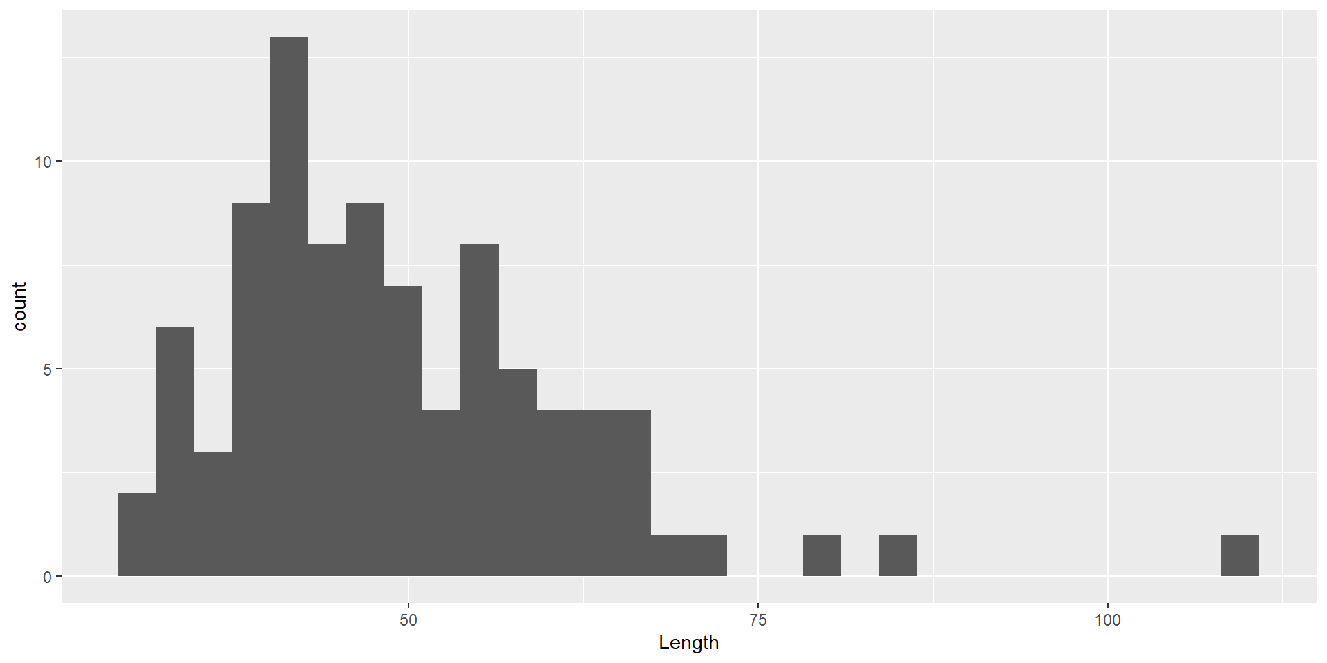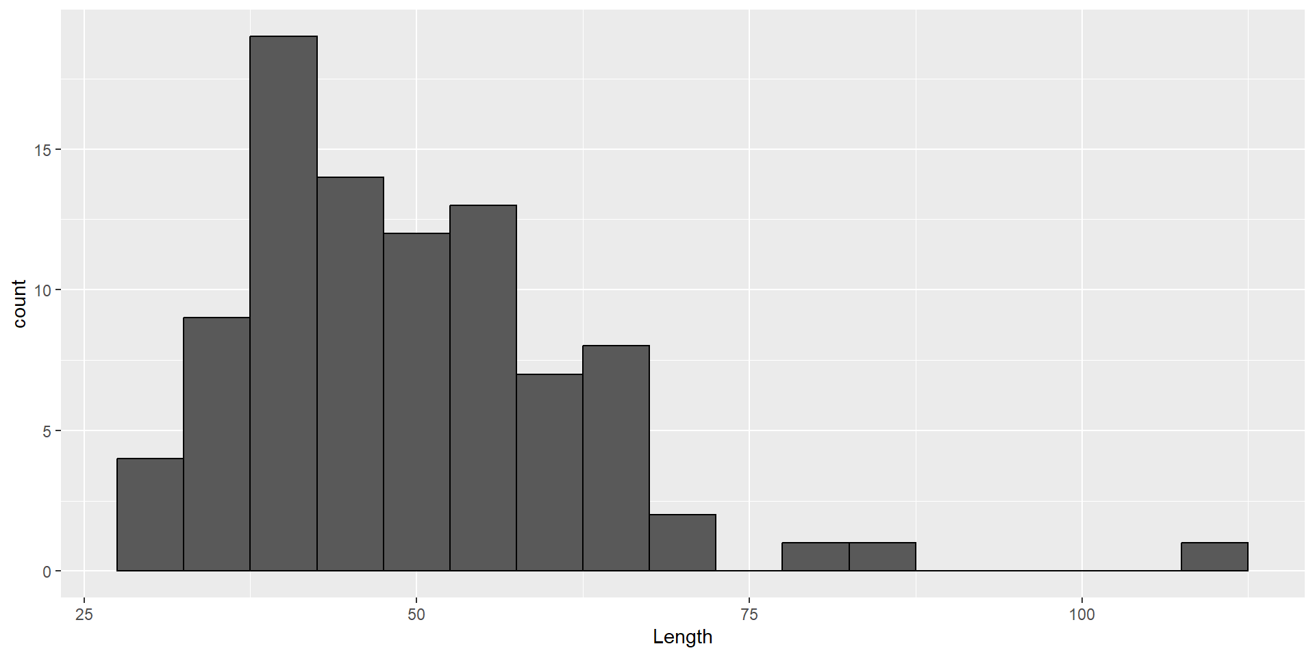 ggplot(dartpoints) +aes(x = Length) +geom_histogram(binwidth =5, color ="black", fill ="white") +labs(x ="Length (cm)", y ="Count")