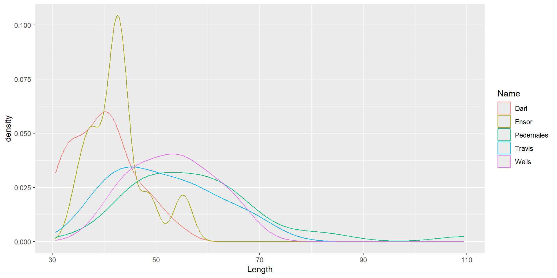 ggplot(dartpoints) +aes(x = Length, color = Name) +geom_density()