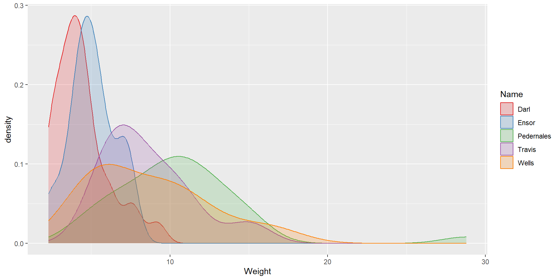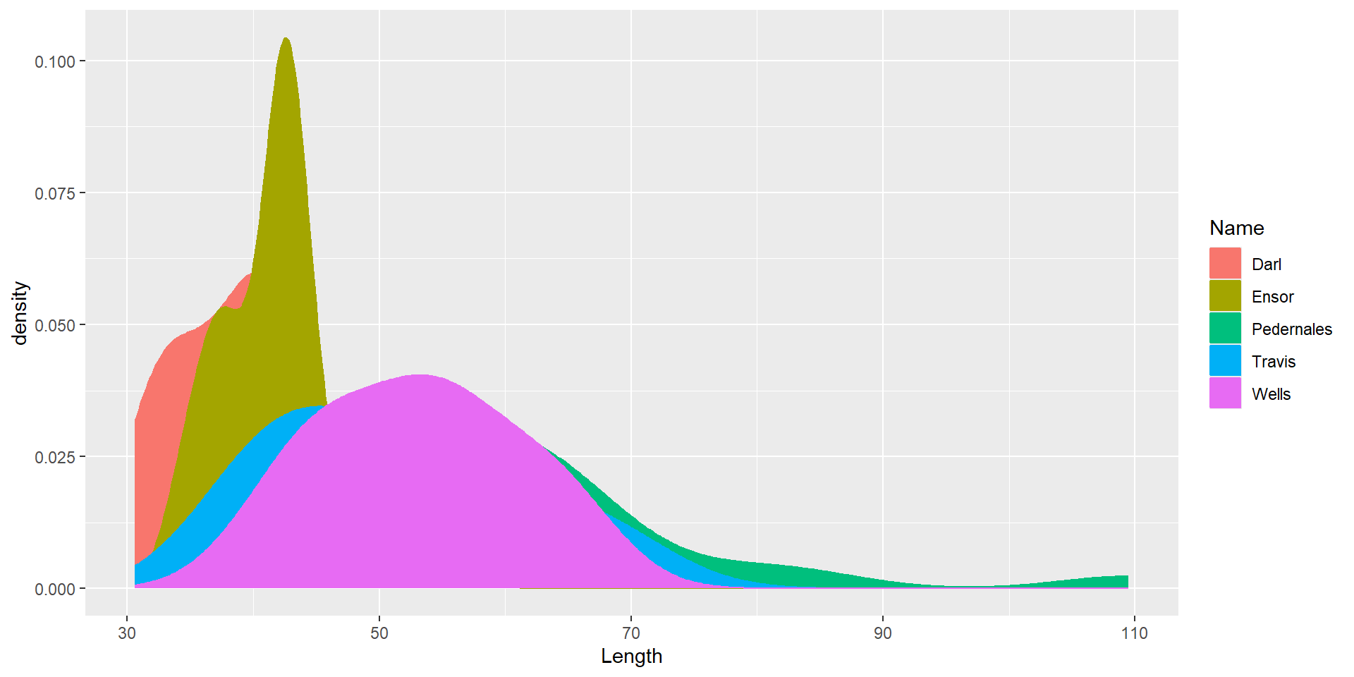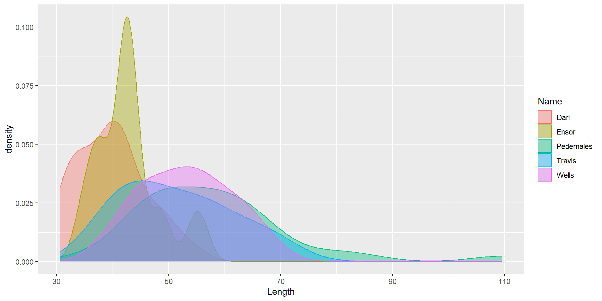 ggplot(dartpoints) +aes(x = Length, color = Name, fill = Name) +geom_density()