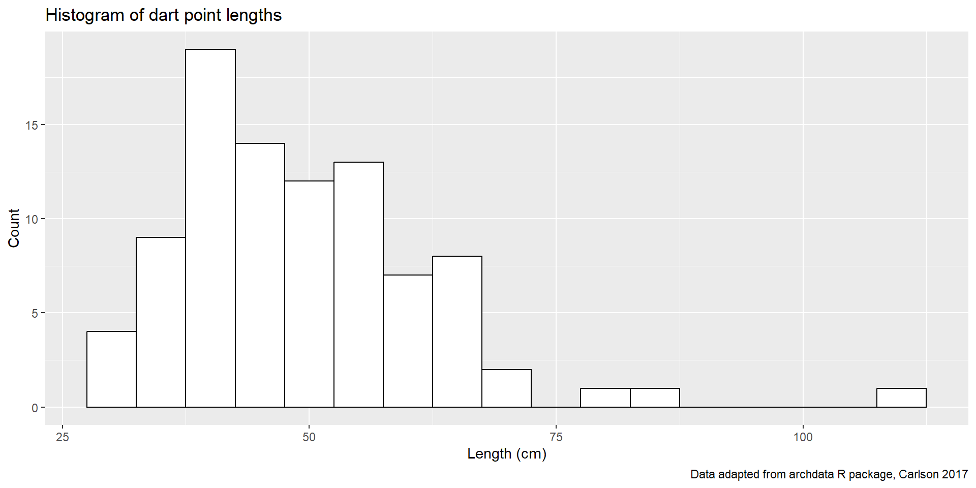 ggplot(dartpoints) +aes(x = Length) +geom_histogram(binwidth =5, color ="black", fill ="white") +labs(x ="Length (cm)", y ="Count",title ="Histogram of dart point lengths", caption ="Data adapted from archdata R package, Carlson 2017")
