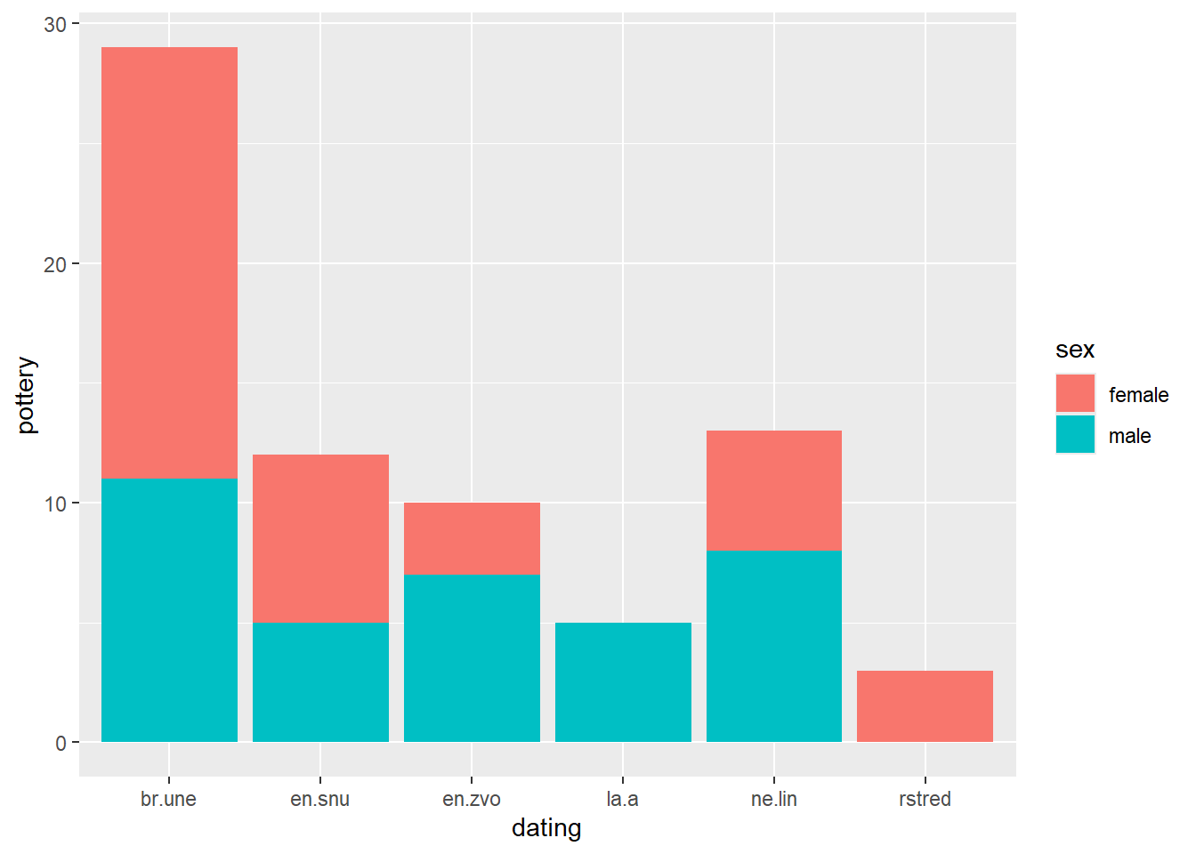 ggplot(df_graves, aes(x = dating, y = pottery, fill = sex))+geom_bar(stat ="identity")