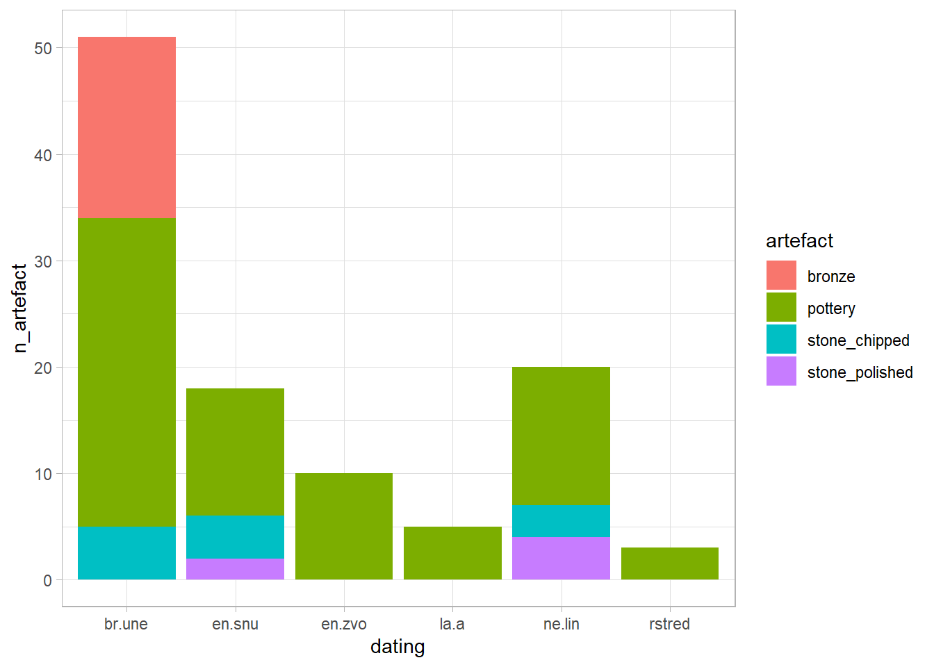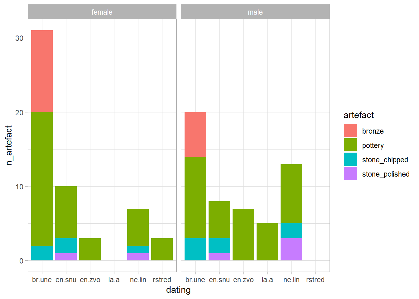 Imagine we want to visualise the relationship between types of artefact, sex, and dating of graves. This can only be achieved by visualising each artefact separately, since they are separated into their own columns, and the argument aes(x = , y = ) of the ggplot() only allows one variable to be visualised in either x or y.