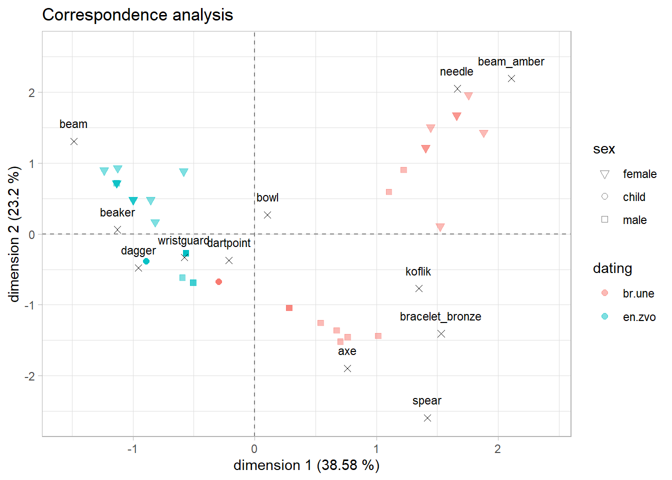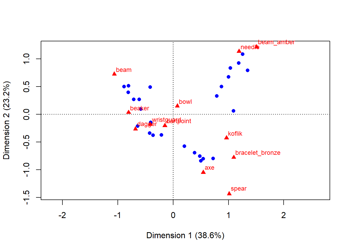 - to answer the question, we will use correspondence analysis to observe similarities between graves (first group of data) based on similarities in proportion of their artefacts (second group of data)