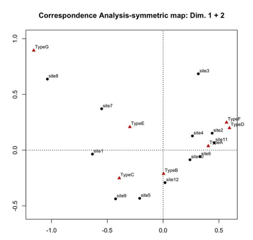 - the above example shows how the biplot can be used to identify the similarities between different archaeological sites, based on the proportion of different ceramic types found there