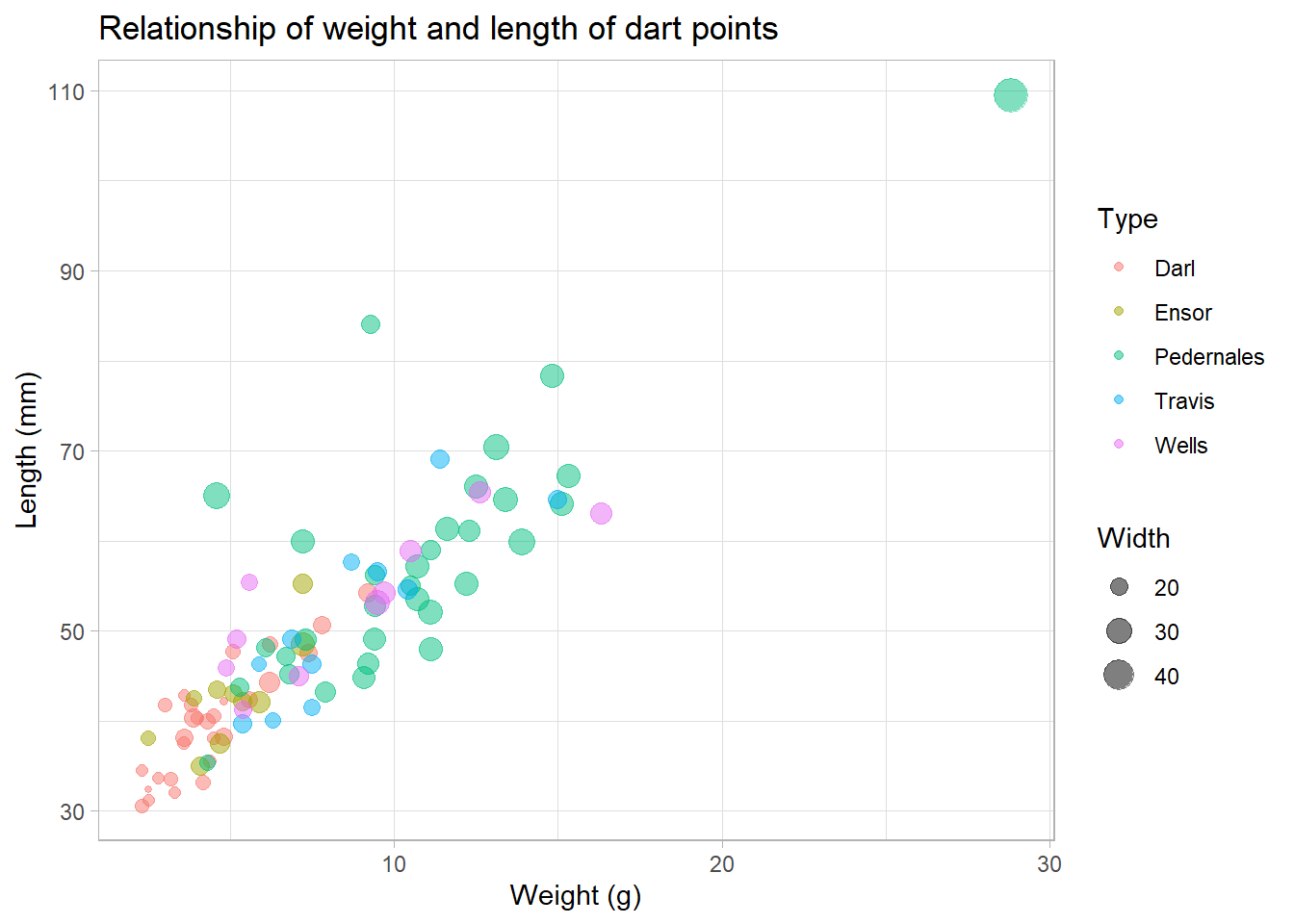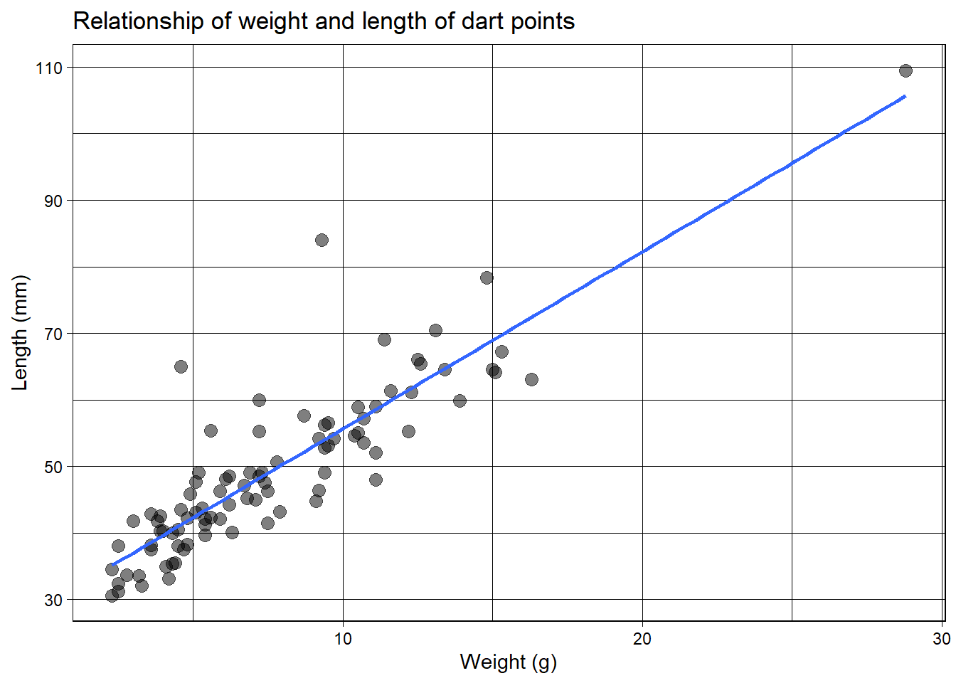 cor(dartpoints$Length, dartpoints$Width)[1] 0.7689932