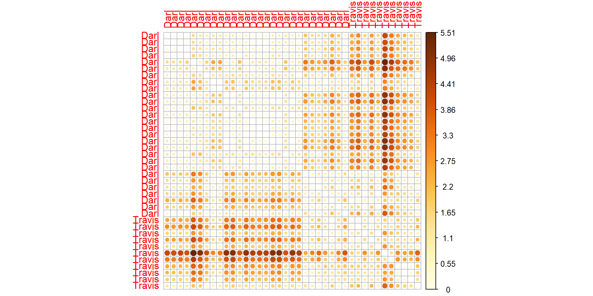 round(as.matrix(darts_d)[1:6, 1:6], 2) Darl Darl Darl Darl Darl Darl