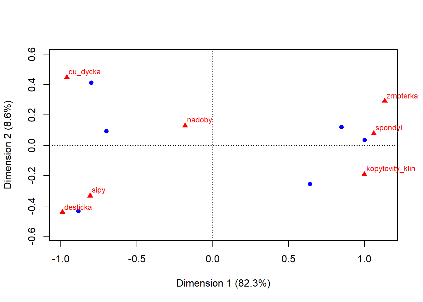 labs(x="Dimenze 1 - 82,3 %", y="Dimenze 2 - 8,6 %",