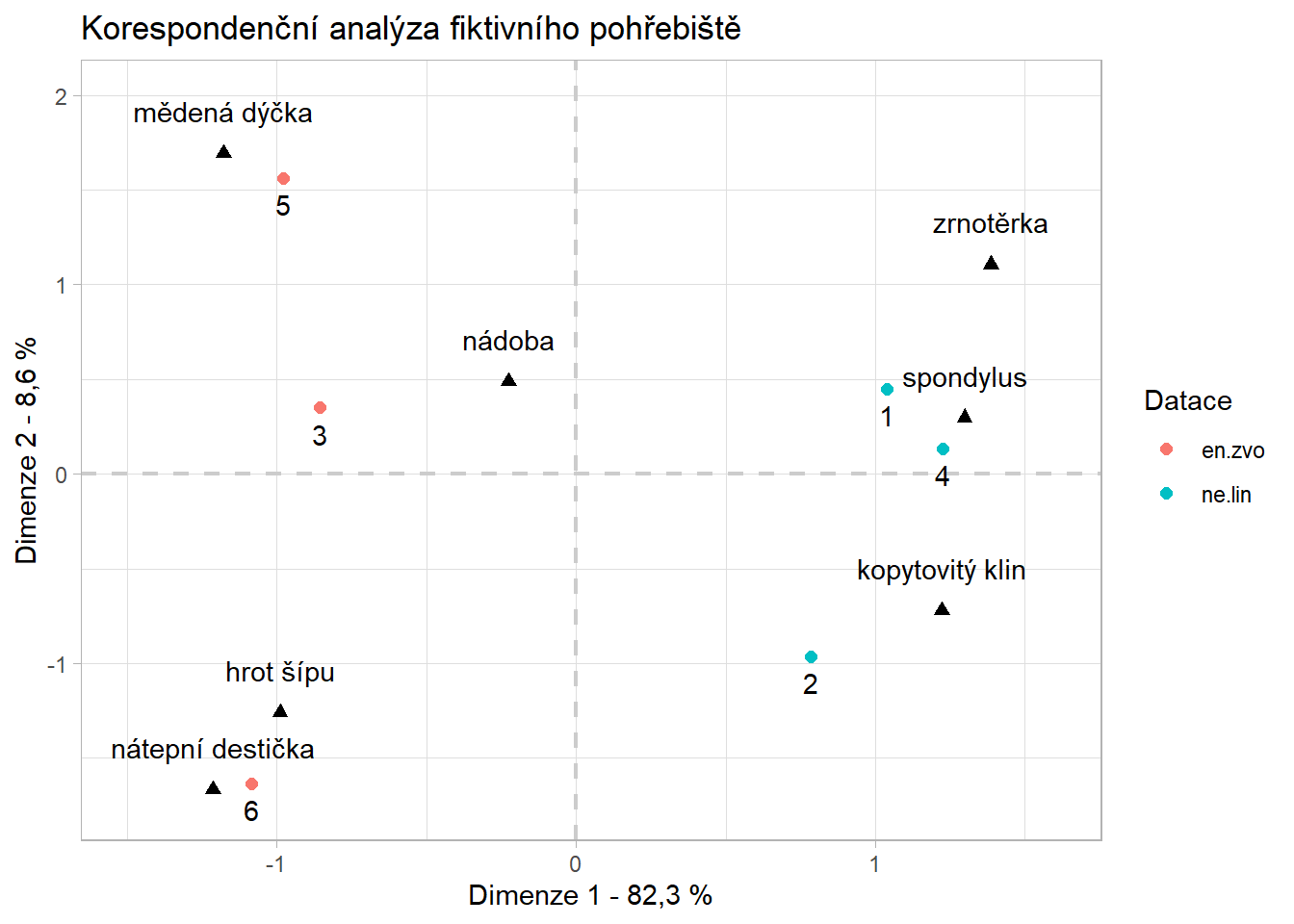title = "Korespondenční analýza fiktivního pohřebiště")+